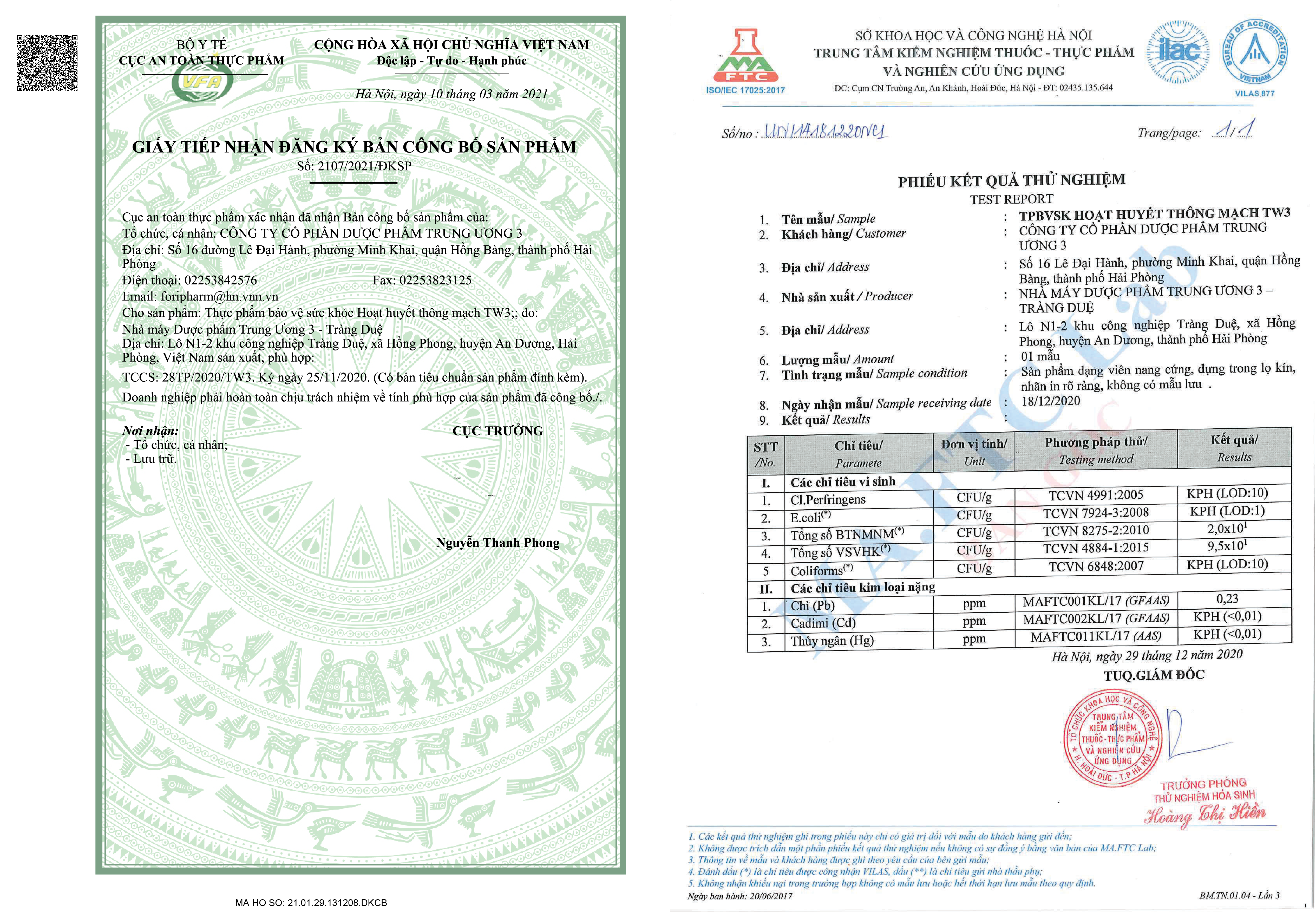 Giấy tiếp nhận - Phiếu kiểm nghiệm Hoạt huyết thông mạch TW3